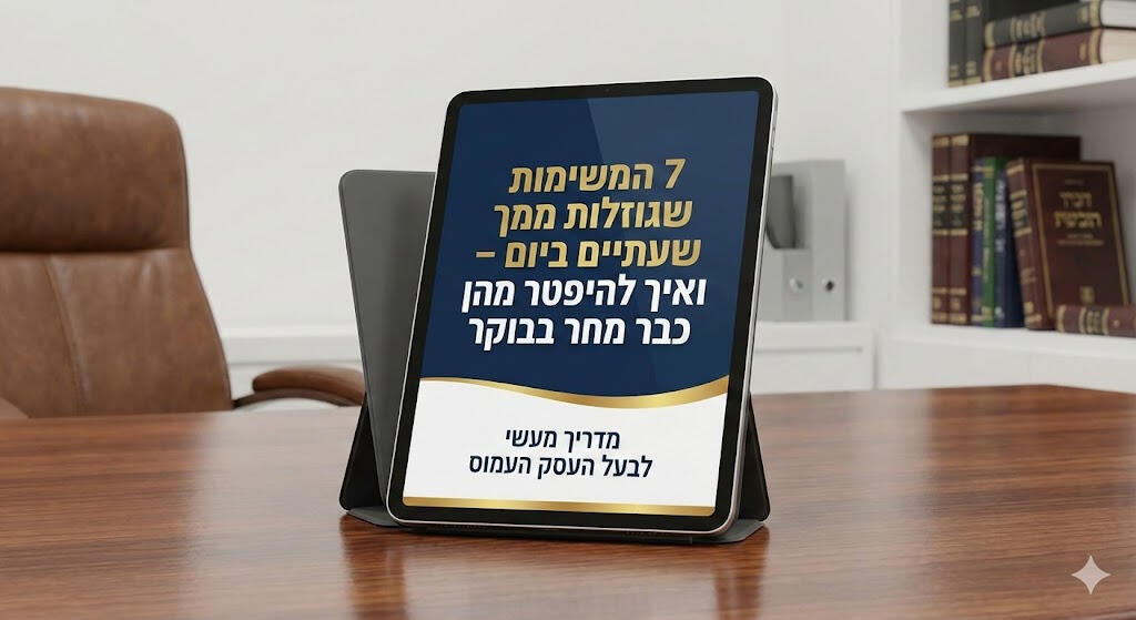 זה לא חייב להיות ככה. האמת היא, שרוב העומס שלך נובע מ-7 משימות ספציפיות שחוזרות על עצמן. ברגע שתזהה אותן ותדע איך לנטרל אותן או להאציל אותן נכון – היומן שלך יתפנה בפתאומיות.במדריך הקצר והממוקד שהכנתי (קריאה של 5 דקות בלבד), תגלה:✅ "גנב הזמן" מס' 1: הפעולה הטכנית שאתה עושה 10 פעמים ביום ואפשר לפתור באוטומציה פשוטה.✅ מלכודת ה"אני רק אענה לזה": איך לסנן פניות בלי לפגוע בשירות הלקוחות.✅ שיטת הניהול שתפנה לך את הראש: איך להפסיק לזכור הכל ולהתחיל לנהל הכל.✅ הצעד הראשון לשחרור: איך להעביר סמכויות גם אם אתה בטוח ש"אף אחד לא יעשה את זה טוב כמוני".